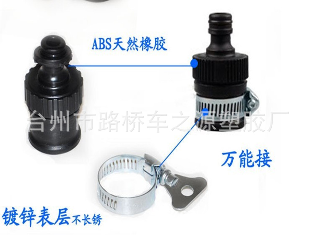 我公司专注于洗车器的开发和生产,各种洗车器配件应有尽有。这款万能接头,特别设计珠链,使用时可以挂在水龙头上面,不用担心滑落。不锈钢喉箍,轻松调节,内有橡胶密封,密封水龙头,不会漏水。