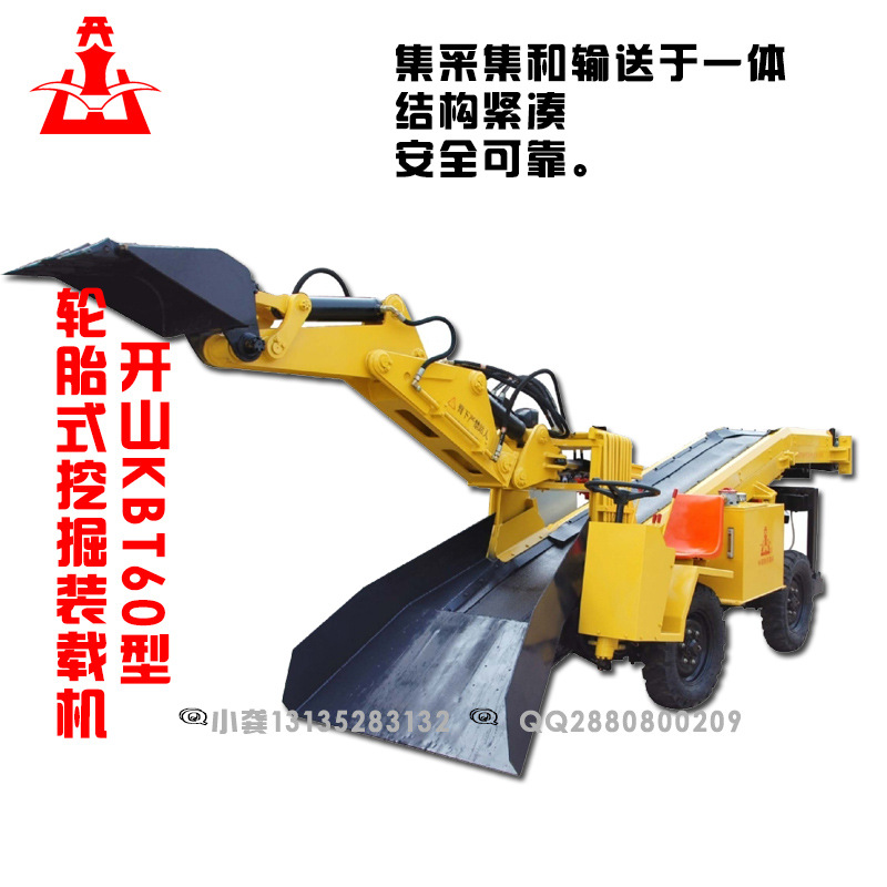 KBT60型轮胎式挖掘装载机集采集和输送于一体,结构紧凑,安全可靠。主要用于一些作业空间狭窄,生产规模较小的金属,非金属、引水洞、掘进洞等非爆破性的碎土石料的采集和输送装车施工。它是由液压机械手与电动输送机构相结合,具有采集和输送功能。该机采用电动机和柴油机联动驱动液压系统,具有移位方便,安全环保,低噪声,功率高的特点。是矿山及小型隧洞出渣理想的扒渣和装车设备。