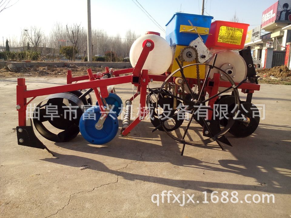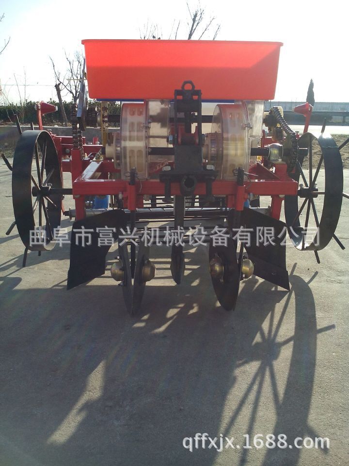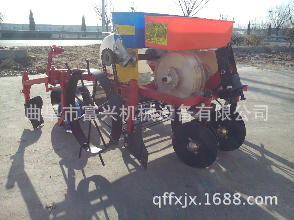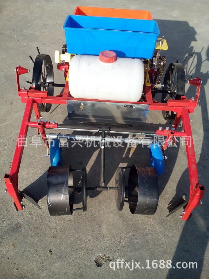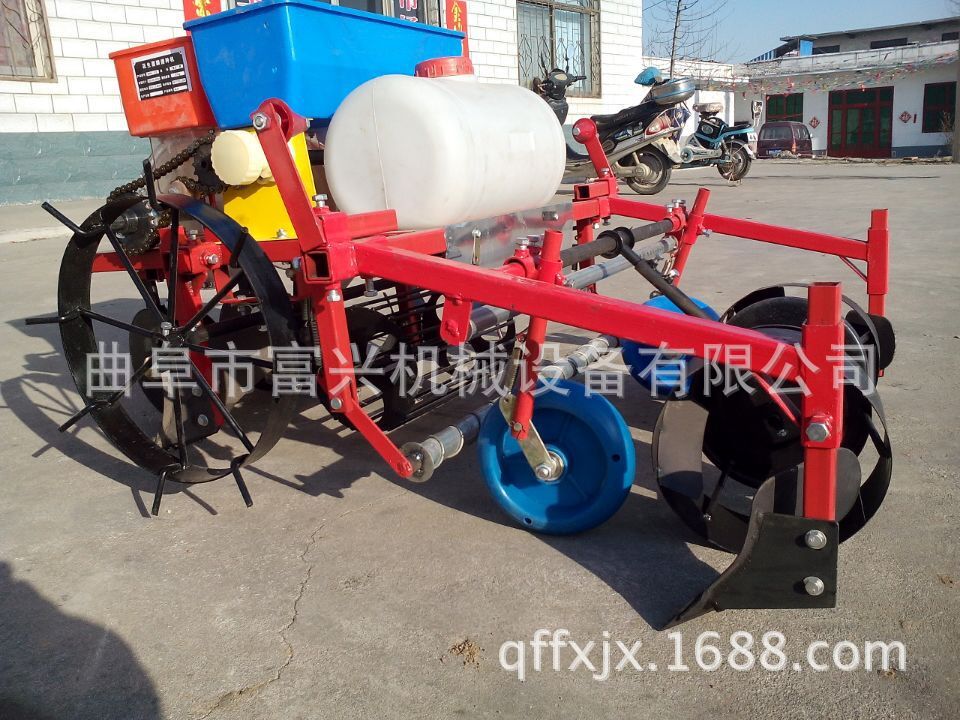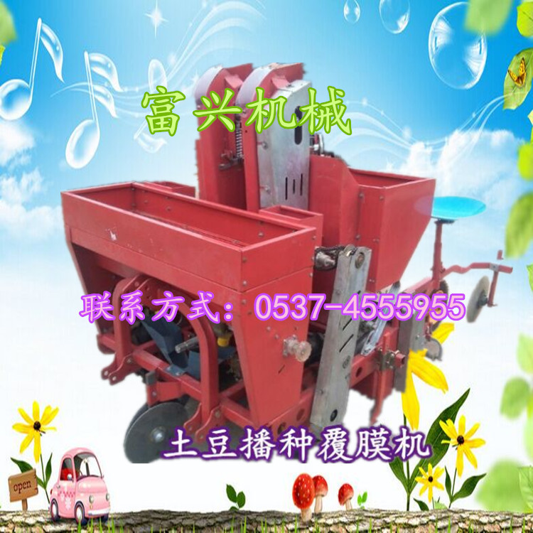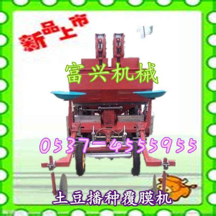 富兴牌大垄双行覆膜马铃薯播种机/土豆播种机(可下滴灌管)本机性能特点:适合各种土壤。并能达到各项农艺要求。种子深浅,起垄高低, 行距和株距,均可调节。一次性完成开沟、施肥、播种、起垄、喷除草剂、铺膜系统。具有结构紧凑、机动性好、布局合理、工作平稳、 适应性强、维修简单等特点。能使种子呈三角形布置,合理使用空间,为增产、长大个打好基础。