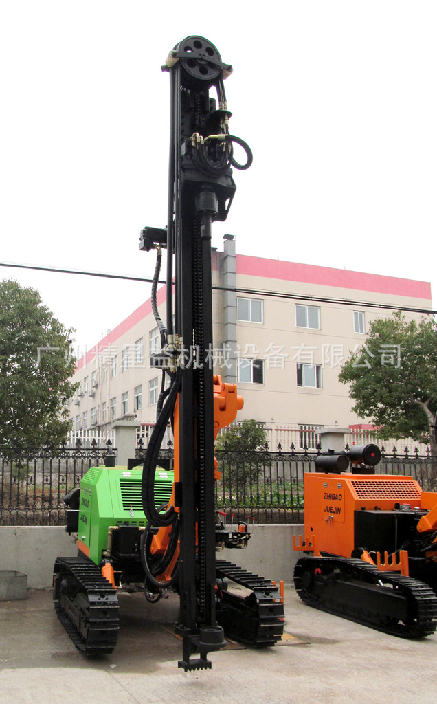 2、行走部分改用了挖掘机配套的四轮一带和柱塞马达加减速器系统,使得该钻车的行走更可靠,耐用性更好。行走速度提高到了3km/h。