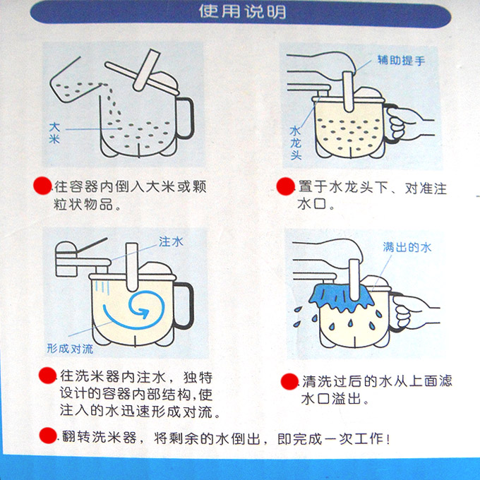【适用】洗米器特殊的内部结构设计,在水流注入洗米器时,形成水的对流,利用水的压力完成清洗的工作,洗过的水从滤水口溢出,可洗涤米类、豆类、葡萄、小蕃茄等颗粒状的食材。免手淘,不沾手,是主妇清洗食材的小帮手。(不可用于粉碎性,细小的.物品清洗)