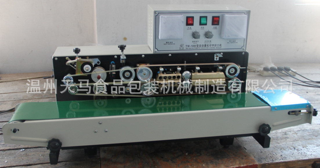 3、当装有物品的包装放置在输送带上,袋的封口部份被自动送入运转中的两根封口带并带入加热区,加热块的热量通过封口带传输到袋的封口部份,使薄膜受热熔软,再通过冷却区,使薄膜表面温度适当下降,然后经过滚花轮(或印字轮)滚压,使封口部份上下塑料薄膜粘合并压制出网状花纹(或印制生产日期),再由导向橡胶带与输送带将封好的包装袋送出机外,完成封口作业。