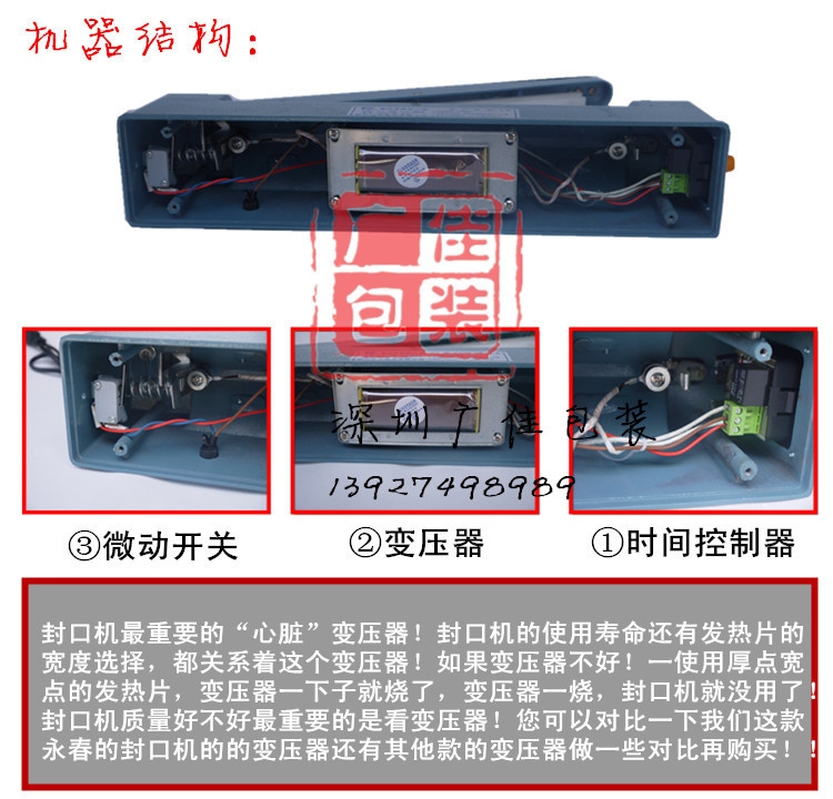 使用方法:本机不用电源开关,插入交流电源插座后,根据要封接材料的厚度,高速加热时间。将袋子放在封接面上,按下手柄,电路即自动控制加热时间。指示灯熄灭时,电源即被自动断开。约1-2秒钟后,放开手柄,就封接好了。