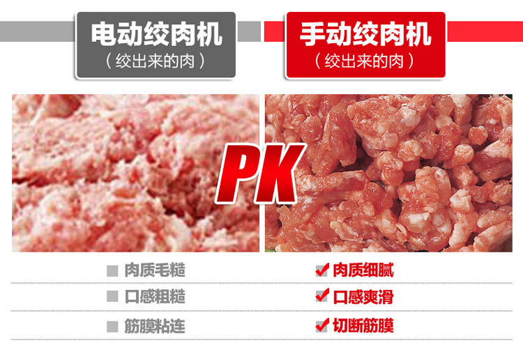 使用小巧门:先把机子罗母转紧,肉切成大概(1公分左右)小肉块。放放机子,同时转动手柄,绞肉机口尽量多放点肉。然后,用手施加点小力。(以便能更快的进入机轴送到刀口)这样就能轻松的绞肉了。