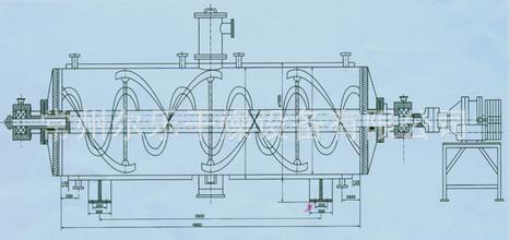 被干燥物料从壳体上方正中间加入,在不断正反转动的耙齿的搅拌下,物料轴向来回走动,与壳体内壁接触的表面不断更新,受到蒸汽的间接加热,耙齿的均匀搅拌,使物料表面水分更有利的排出,气化的水分经干式除尘器、湿式除尘器、冷凝器,从真空泵出口处放空。