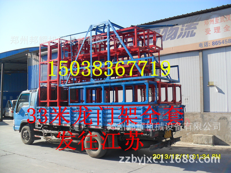 有起升滑轮、套架、手动卷扬机、自翻卡板和扒杆,它把两立柱始终连成一整体门