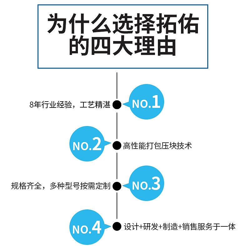 1、结构简单、性价比高、压缩速度快、自动化、效率高、机器使用寿命长,操作方式为电动控制,能实现自动打包、自动限行程。