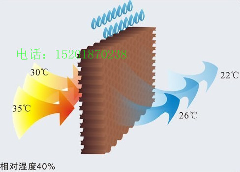 该蒸发式降温换气机是引进欧美国家的高科技产品,其降温原理是:通过风机抽风,机内产生负压,空气穿过湿帘,同时水泵把水输送到湿帘上的布水管,水均匀地湿润整个湿帘的接触面,而且湿帘的特殊角度使水流直接流向空气进风的一侧,吸收空气中大量的热量,使通过湿帘的空气降温,同时得到过滤使送出的风变得凉爽、湿润且清新。而未蒸发的水落回底盘,形成水路循环,从而达到环保、节能的效果。