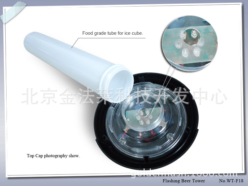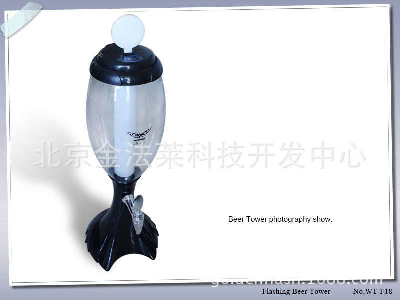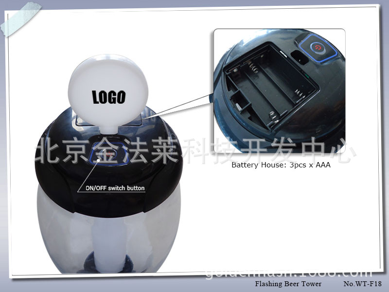 LED啤酒款酒炮,酒塔, 又名分酒器,目前现有颜色红,黄,蓝,绿,黑。也可以订制其它颜色,起订量为100个。 内置LED七彩灯,灯色变幻多彩,全部为食品级材料。可以印刷logo或者贴贴透明全色不干胶。产品带印刷牌使用3节7号电池,不带logo牌为3节AG13电池。容量分3L 和1.5L 款。